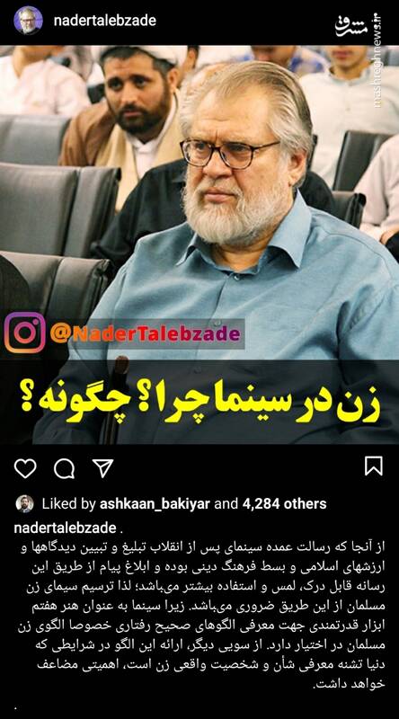 به گزارش مشرق، نادر طالبزاده، مستندساز در صفحه اینستاگرام خود نوشت: از آنجا که رسالت عمده سینمای پس از انقلاب تبلیغ و تبیین دیدگاهها و ارزشهای اسلامی و بسط فرهنگ دینی بوده و ابلاغ پیام از طریق این رسانه قابل درک، لمس و استفاده بیشتر میباشد؛