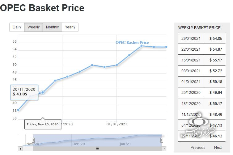 سبد نفتی اوپک در هفته منتهی به 29 ژانویه 2021 یعنی جمعه 10 بهمن، 54.85 دلار در هر بشکه فروخته شد.