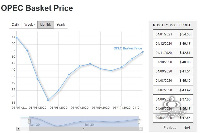 کمترین قیمت سبد نفتی اوپک در سال 2021 برابر با 50.78 دلار در هر بشکه در 5 ژانویه ثبت شده است.