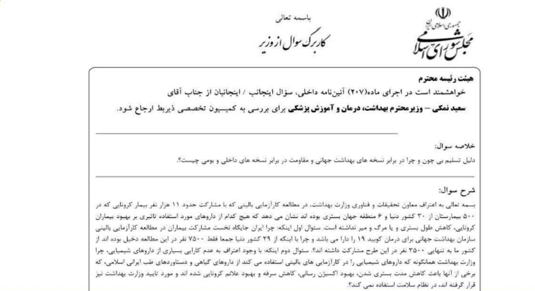 در شرح سؤال نماینده کرج از وزیر بهداشت آمده است: به اعتراف معاون تحقیقات و فناوری وزارت بهداشت در مطالعه کارآزمایی بالینی که با مشارکت حدود 11 هزار نفر بیمار کرونایی که در 500 بیمارستان از 30 کشور دنیا و 6 منطقه جهان بستری بودهاند نشان میدهد که هیچ کدام از داروهای مورد استفاده تأثیری بر بهبود بیماران کرونایی، کاهش طول بستری و یا مرگ و میر نداشته است.