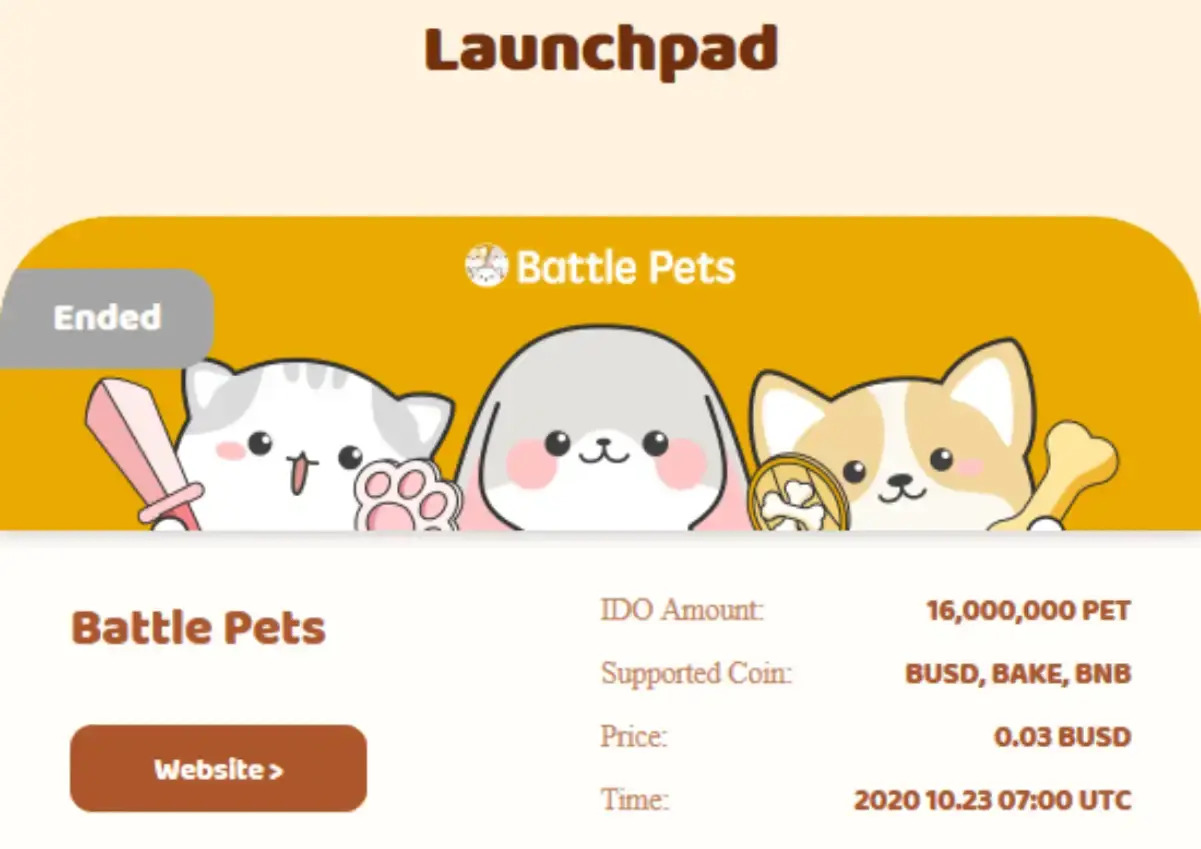 بیکریسواپ یک لانچپد دارد که به پروژههای منحصر به فرد و در حال ظهور اختصاص دارد. اولین پروژه روی این پلتفرم Battle Pets بود. سرمایهگذاری در این پروژه با استفاده از BUSD، BAKE یا BNB انجام میشد و هر توکن PET با قیمت 0.03 دلار به فروش میرسید. بسته به میزان سرمایهگذاری، کاربران به یک بچه گربه، تولهسگ یا خرگوش دست مییافتند.