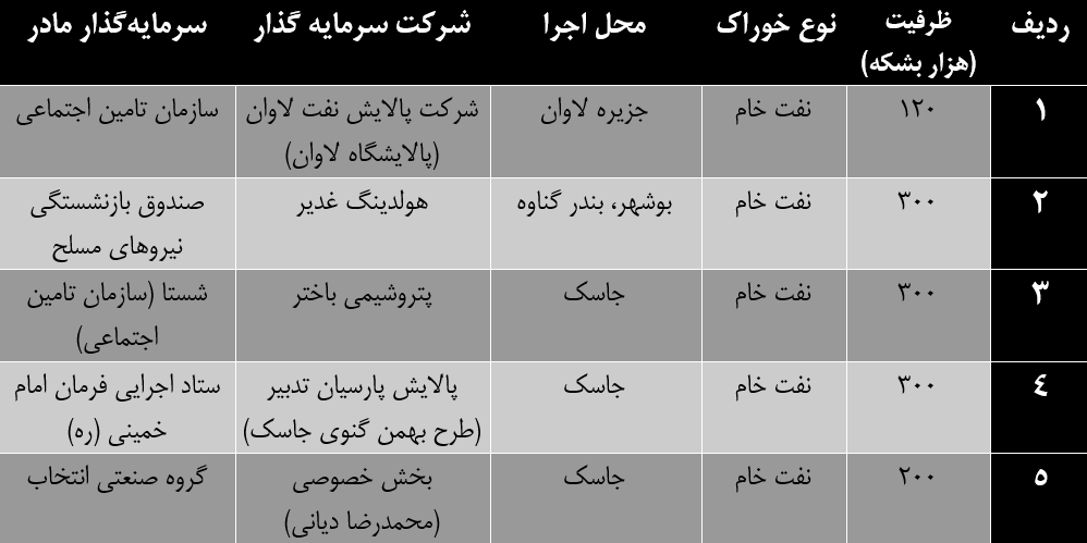 جدول 1- طرح پتروپالایشی ذیل قانون حمایت از توسعه صنایع پاییندستی