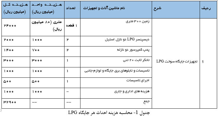 در جدول 1 هزینههای احداث یک جایگاه LPG محاسبه شده است که بر این اساس هزینه احداث هر جایگاه حدود 3.3 میلیارد تومان برآورد میشود، درحالیکه در محاسبه مدیر پژوهش و فناوری شرکت ملی پالایش و پخش این رقم 25 میلیارد تومان در نظر گرفته شده بود. اینکه هزینهها در محاسبه مدیر پژوهش پالایش و پخش از کجا و به چه شیوهای استخراج شده محل سوال جدی است.