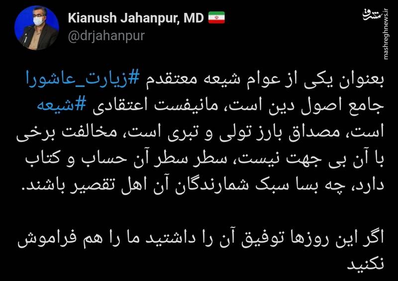 به گزارش مشرق، کیانوش جهان پور، رئیس روابط عمومی وزارت بهداشت همزمان با عاشورای حسینی در توییتر نوشت: بعنوان یکی از عوام شیعه معتقدم زیارت عاشورا جامع اصول دین است، مانیفست اعتقادی شیعه است، مصداق بارز تولی و تبری است، مخالفت برخی با آن بی جهت نیست، سطر سطر آن حساب و کتاب دارد، چه بسا سبک شمارندگان آن اهل تقصیر باشند.