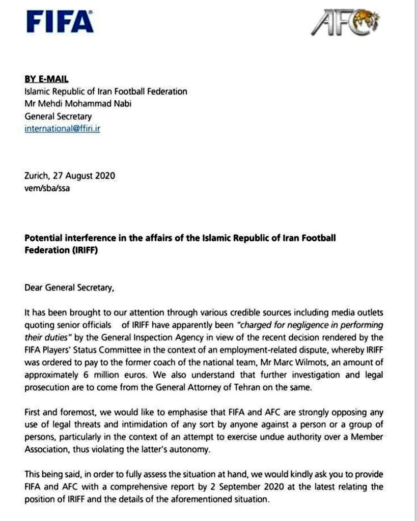 با توجه به این مساله، برای آن‌که تمام زوایای قضیه روشن شود، از شما درخواست می‌کنیم تا روز دوم سپتامبر ۲۰۲۰ برای ای‌اف‌سی و فیفا مدارک لازم و مرتبط با وضعیت فدراسیون فوتبال و اتهام‌های طرح شده را ارسال کنید.