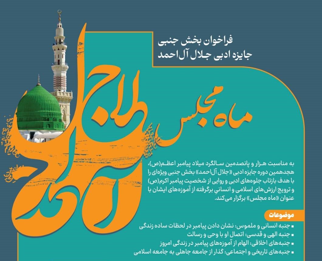 به گزارش گروه فرهنگی خبرگزاری دانشجو، به مناسبت هزاوپانصدمین سالگرد میلاد پیامبر اعظم (ص)، هجدهمین دوره جایزه ادبی «جلال آلاحمد» بخش جنبی ویژهای با عنوان «ماه مجلس» برگزار میکند. این بخش با هدف بازتاب جلوههای ادبی و روایی از شخصیت پیامبر اکرم (ص) و ترویج ارزشهای اسلامی و انسانی برگرفته از تعالیم ایشان طراحی شده است.