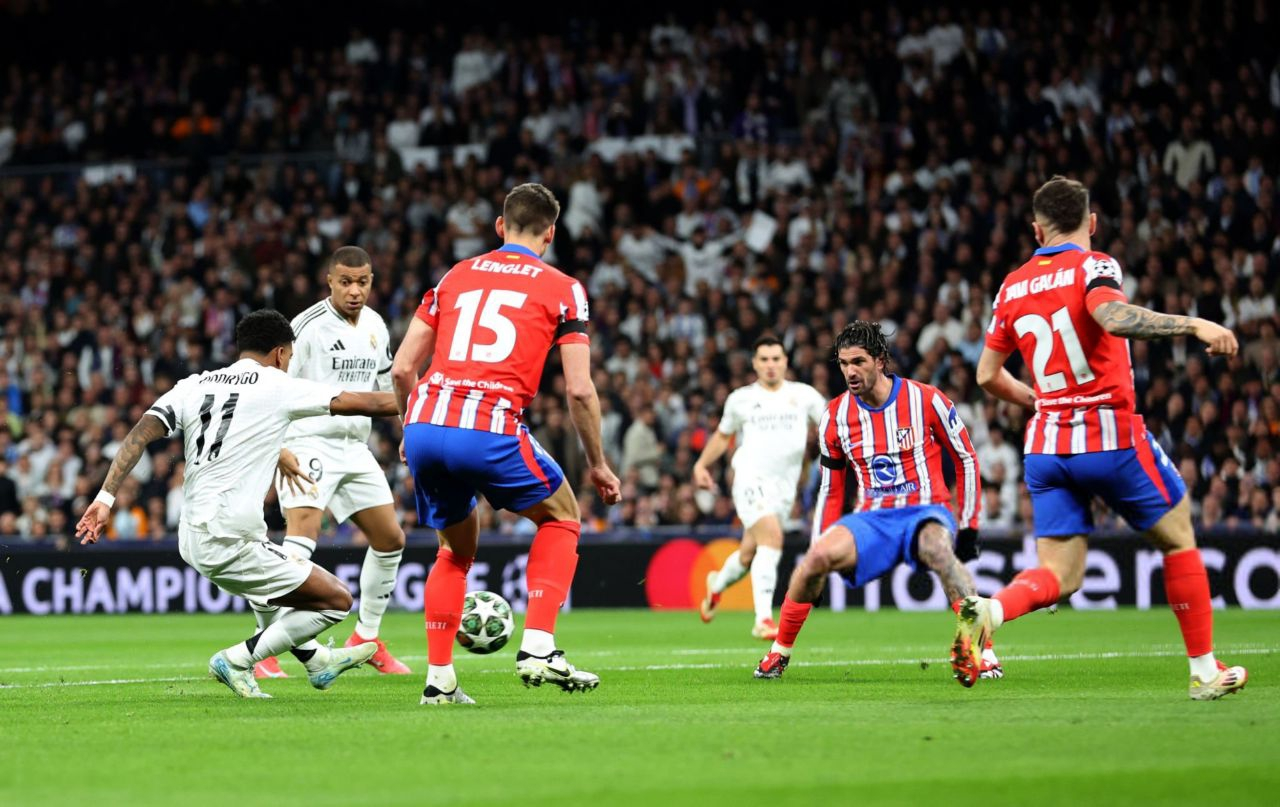دربی جذاب مادرید با فشار حملات میزبان آغاز شد و شاگردان کارلو آنچلوتی موفق شدند در دقیقه ۴ گل اول را به ثمر برسانند، پاس در عمق تماشایی فدریکو والورده پشت مدافعین اتلتیکو به رودریگو رسید و این ستاره برزیلی بعد از حرکت در عرض با یک شوت تماشایی توپ را به گوشه دروازه اوبلاک فرستاد.