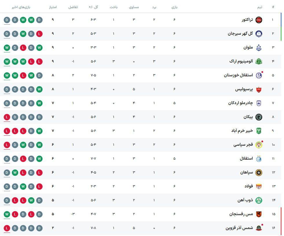 در شش بازی گذشته، تراکتور، مدافع عنوان قهرمانی، موفق شده است با کسب ۹ امتیاز در صدر جدول قرار بگیرد، اما این ۹ امتیاز برای تیم صدرنشین به نوعی نمادی از افت شدید لیگ ایران است. در واقع، از جایگاه سیزدهم جدول تا صدرنشین تنها سه امتیاز فاصله است. این یعنی فولاد خوزستان که در رده ۱۳ جدول قرار دارد، با یک برد میتواند ۱۳ پله صعود کند و به صدر جدول برسد. این وضعیت نشاندهنده عدم ثبات در نتایج و قدرت تیمها در لیگ برتر ایران است.