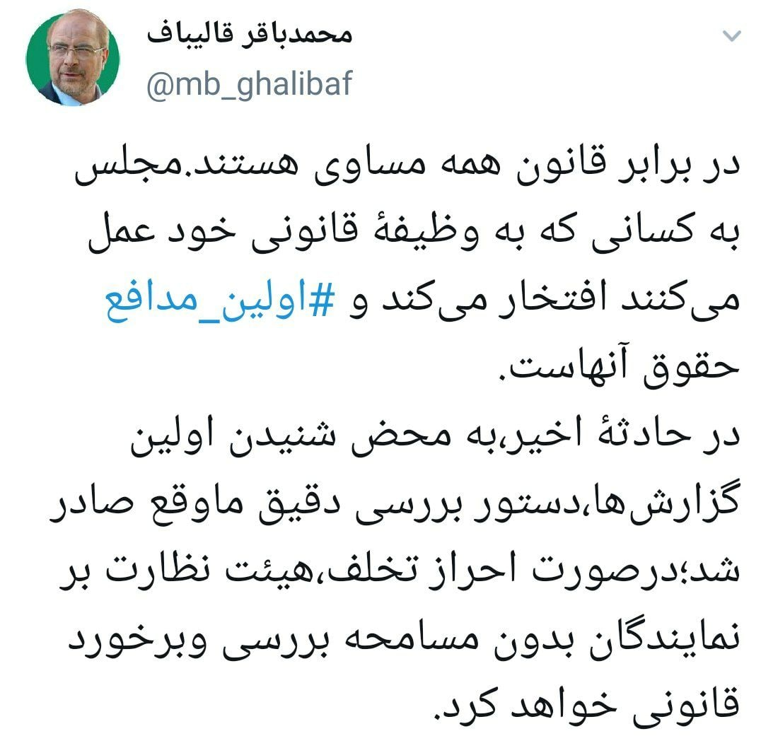 با این حال اما محمدباقر قالیباف رئیس مجلس شورای اسلامی هم در واکنش به انتشار فیلمی مبنی بر برخورد نامناسب یک نماینده مجلس با یک سرباز راهنمایی و رانندگی در صفحه شخصی خود نوشت: در برابر قانون همه مساوی هستند. مجلس به کسانی که به وظیفۀ قانونی خود عمل می‌کنند افتخار می‌کند و ‎اولین مدافع حقوق آنهاست.
