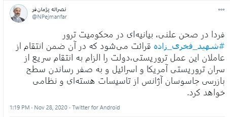 فردا در صحن علنی، بیانیهای در محکومیت ترور شهید فخری زاده قرائت میشود که در آن ضمن انتقام از عاملان این عمل تروریستی، دولت را الزام به انتقام سریع از سران تروریستی آمریکا و اسرائیل و به صفر رساندن سطح بازرسی جاسوسان آژانس از تاسیسات هستهای و نظامی خواهد کرد.