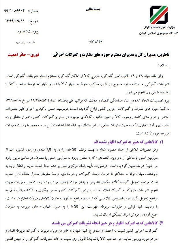 پیرو تصمیمات اتخاذ شده در ستاد هماهنگی اقتصادی دولت که مراتب طی بخشنامۀ شمارۀ 978554/99 مورخ 18/8/1399 به کلیۀ حوزه های نظارت و گمرکات اجرایی کشور ابلاغ گردیده است، بدینوسیله ضمن تأکید بر اجرای دقیق مصوبات ابلاغی و در راستای کاهش رسوب کالا و تعیین تکلیف کالاهای موجود در بنادر و گمرکات کشور، اعم از مناطق ویژه اقتصادی و آزاد تجاری (که به جهت واردات قطعی در این مناطق دپو شده اند) اقدامات ذیل در سه محور با رعایت مقررات مربوطه مورد تأکید است: