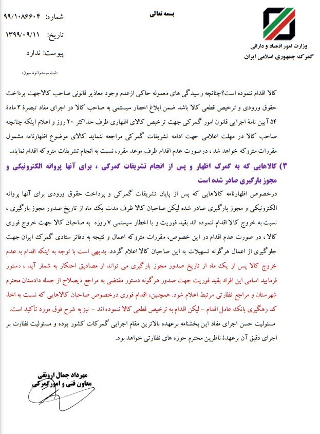در این نامه آمده است: وفق مفاد مواد 38 و 39 قانون امور گمرکی، خروج کالا از اماکن گمرکی، مستلزم انجام تشریفات گمرکی است. تشریفات گمرکی به استثناء موارد مندرج در قانون مذکور، منوط به اظهار کالا با تسلیم اظهارنامه توسط صاحب کالا یا نمایندۀ قانونی وی انجام می شود.
