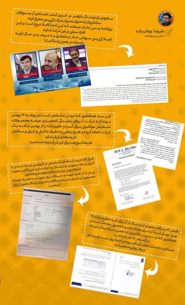 کمپانی کُرهای بخاطر روابط مناسبی که از قبل با ایرانیها داشت، چند نمونه کیت رایگان ارسال کرد. بعد از انعقاد قرارداد اما، شبکه سعودیمسلک ایراناینترنشنال مدعی وجود یک فساد گسترده در واردات کیتهای کرونا شد. فسادی که بنابر تخیلات آن شبکه در رأس آن ستاد اجرایی فرمان امام(ره) و سپاه پاسداران قرار داشت! همین گزارش شست آمریکاییها را خبردار کرد. سریع برای ابطال خط مالی دستبهکار شدند؛ امضای قرارداد خشکنشده، منتفی شد: