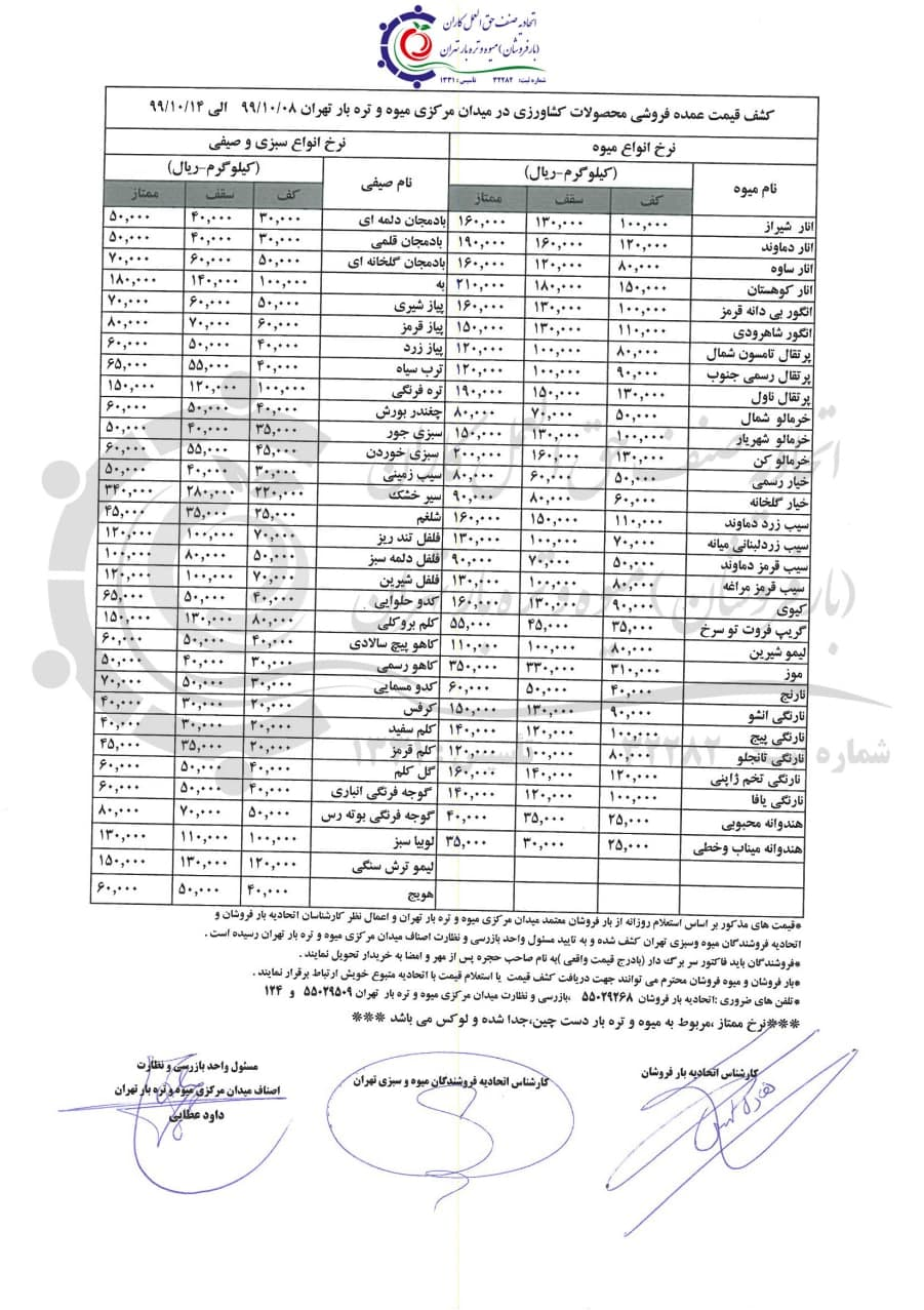 جدیدترین قیمت انواع میوه در میدان مرکزی میوه و تره بار تهران که محل عرضه عمده فروشی است و از آنجا به تمام مغازه های سطح تهران و حتی سایر شهرها سرازیر می شود به این شرح است: