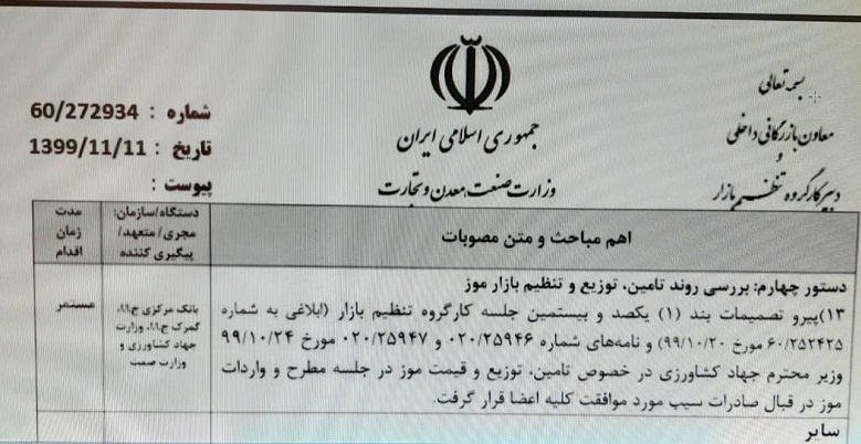 دوشنبه ۱۳ بهمن ۱۳۹۹ – ۱۸:۵۳ واردات موز در مقابل صادرات سیب آزاد شد + سند