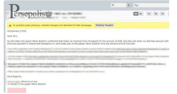 این بازیکن برای دریافت مطالبات خود به کمیته انضباطی فدراسیون جهانی فوتبال، فیفا شکایت کرده بود اما به دلیل مشکلات در انتقال پول، واریز این مبلغ از طلب او نیازمند صرف زمان بیشتری بود. ساعتی پیش ایمیلی از سوی وکیل این بازیکن مبنی بر تایید دریافت ۲۵۰ هزار یورو به باشگاه پرسپولیس ارسال شد. در بخشی از این نامه آمده: 《آقایان محترم؛ توسط این نامه بازیکن ماریو بودیمیر تایید میکند که امروز او مبلغ یکصد و نود هزار یورو را از پرسپولیس دریافت کرده و وقتی این مبلغ به مبلغ دریافتی قبلی اضافه شود بدان معناست که باشگاه پرسپولیس تا امروز مبلغ دویست و پنجاه هزار یورو پرداخت کرده است.》