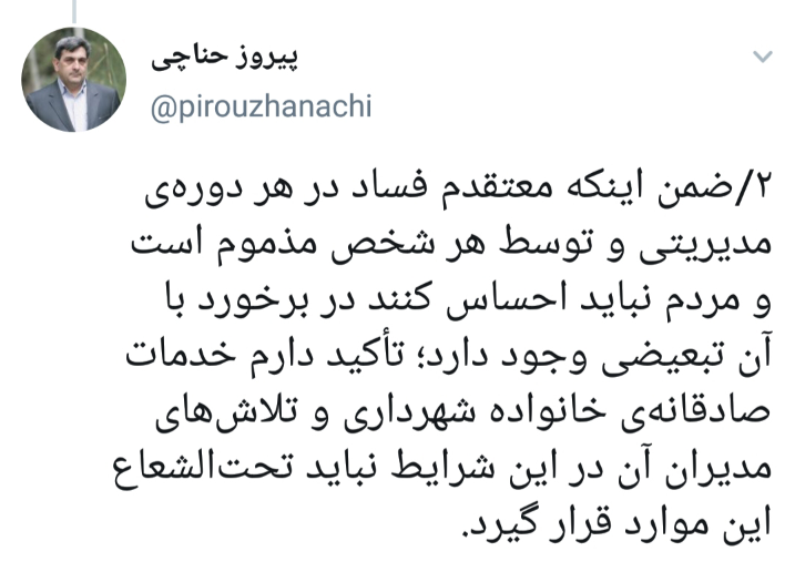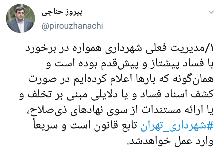 به گزارش خبرنگار شهری خبرگزاری فارس، پیروز حناچی شهردار تهران در صفحه شخصی خود در توئیتر درباره ماجرای دستگیری شهرداران مناطق ۲ و ۸ در پایتخت اظهار داشت: مدیریت فعلی شهرداری همواره در برخورد با فساد پیشتاز و پیش قدم بوده است و همانگونه که بارها اعلام کردهایم در صورت کشف اسناد فساد و یا دلایلی مبنی بر تخلف یا ارائه مستندات از سوی نهادهای ذی صلاح شهرداری تهران تابع قانون است و سریعاً وارد عمل خواهد شد.