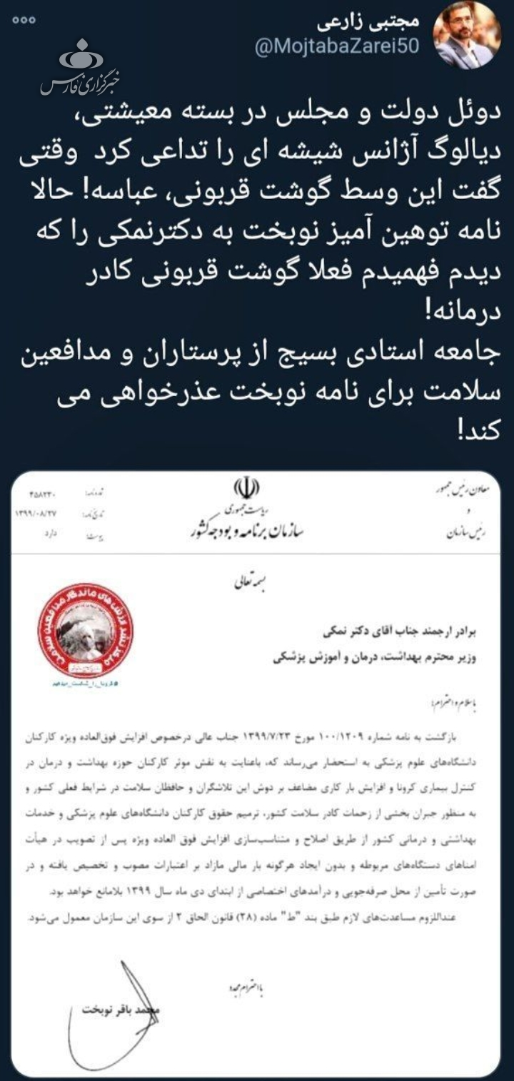 زارعی ادامه داد: نامه توهین آمیز نوبخت به دکترنمکی را که دیدم فهمیدم فعلا گوشت قربونی کادر درمانه! جامعه استادی بسیج از پرستاران و مدافعین سلامت برای نامه نوبخت عذرخواهی می کند!