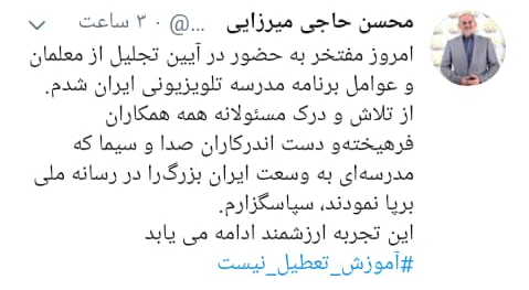 به گزارش خبرنگار آموزش و پرورش خبرگزاری فارس، محسن حاجیمیرزایی وزیر آموزش و پرورش در صفحه شخصی خود در توئیتر نوشت: امروز مفتخر به حضور در آیین تجلیل از معلمان و عوامل برنامه مدرسه تلویزیونی ایران شدم.