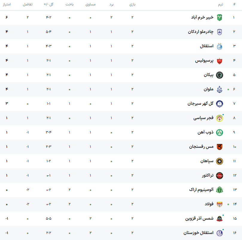 وضعیت جدول لیگ برتر نشان می دهد که دو تیم خیبر خرم آباد و چادرملو جایگاه اول و دوم را دارند و استقلال و پرسپولیس در جایگاه های سوم و چهارم قرار گرفته اند.