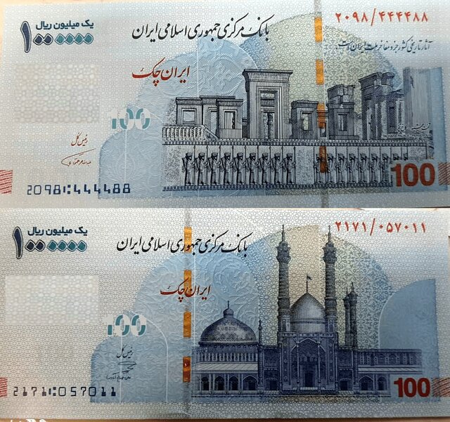 در طراحی این اسکناسهای جدید از عناصر مذهبی، فرهنگی، هنری و تاریخی کشور استفاده شد و در این بین بهتازگی ایران چک ۱۰۰ هزار تومانی با امضای علی صالحآبادی_رئیس کل فعلی بانک مرکزی چاپ شده است که از روی ایران چک ۱۰۰ هزار تومانی جدید تصویر تخت جمشید حذف شده و از بارگاه حضرت معصومه (س) استفاده شده است. در پشت ایران چک جدید نیز از تصویر میدان گازی پارس جنوبی استفاده شده است.