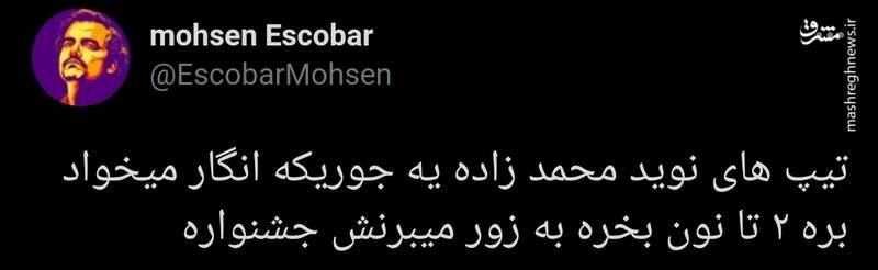 به گزارش مشرق، کاربرفضای مجازی در توییتی نوشت: تیپ های نوید محمد زاده یه جوریکه انگار میخواد بره ۲ تا نون بخره به زور میبرنش جشنواره