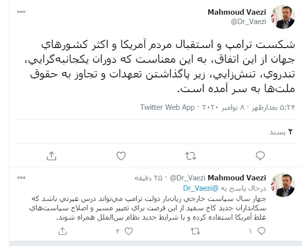 به گزارش خبرگزاری فارس، محمود واعظی رئیس دفتر رئیس جمهوری در صفحه شخصی خود در توئیتر خاطرنشان کرد: چهار سال سیاست خارجی زیانبار دولت ترامپ درس عبرتی برای سکانداران جدید کاخ سفید است.