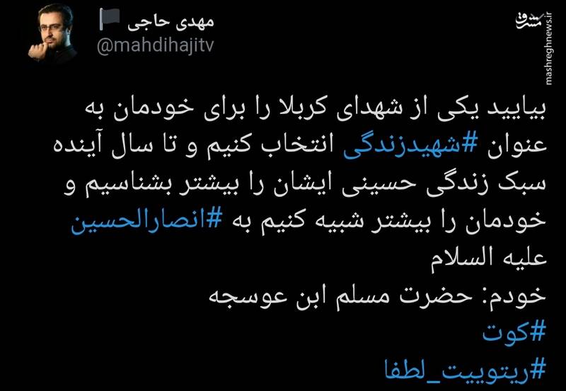 به گزارش مشرق، یک کاربر فضای مجازی در توییتر نوشت: بیایید یکی از شهدای کربلا را برای خودمان به عنوان شهید زندگی انتخاب کنیم و تا سال آینده سبک زندگی حسینی ایشان را بیشتر بشناسیم و خودمان را بیشتر شبیه کنیم به انصارالحسین علیه السلام