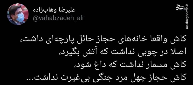 به گزارش مشرق، علیرضا وهاب زاده، مشاور وزیر بهداشت به مناسبت شهادت حضرت زهرا سلام الله علیها طی توییتی نوشت: کاش واقعا خانههای حجاز حائل پارچهای داشت، اصلا در چوبی نداشت که آتش بگیرد، کاش مسمار نداشت که داغ شود، کاش حجاز چهل مرد جنگی بیغیرت نداشت…