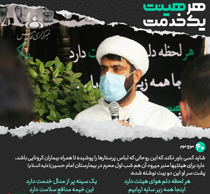 گروه جامعه خبرگزاری فارس؛ مریم شریفی: «این فقط حرف من نیست. مکرر از رفقایی که دهه محرم دور از خانه و خانواده در بیمارستان مشغول خدمت به بیماران و کادر درمانی کرونا بودند، شنیدم که میگفتند: این بهترین دهه محرم عمر ما بود…» وقتی طرح «هر هیئت، یک خدمت» با محوریت حضور جمعی از طلبهها و نیروهای هیئتی و جهادی در بیمارستان برای کمک به کادر درمانی و بیماران مبتلا به کرونا و ارائه خدمات متنوع فرهنگی در دهه اول محرم کلید خورد، شبکههای آن طرف آبی با دستپاچگی همراه با عصبانیت با تیترهایی مثل «اعزام آخوند برای برگزاری مراسم عزاداری در بیمارستان» به آن واکنش نشان دادند. اما آنچه در روزهای بعد بهواسطه حضور این نیروهای داوطلب در بخش کرونا رقم خورد، جز صحنههای زیبای محبت به همنوع و قدردانی از زحمات خادمان مردم، چیزی نبود. و این یعنی رسیدن به همان نقطه طلایی در مسیر عشق به امام حسین (ع). محبت به دوستداران اهل بیت (ع)، کمک به نیازمندان جسمی و روحی و مالی و تلاش برای بازگرداندن انسانهای دردمند و خسته به زندگی، جلوههای عینی عشق به سالار شهیدان (ع) است که امسال طلبههای هیئتی و جهادی در نمایش آن در سنگری متفاوت، سنگ تمام گذاشتند.