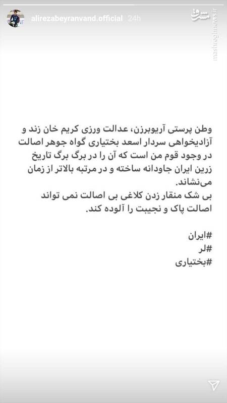 به گزارش مشرق، علیرضا بیرانوند، فوتبالیست در واکنش به اظهارات بهاره رهنما درباره قوم لر در صفحه اینستاگرام خود نوشت: وطن پرستی آریوبرزن، عدالت ورزی کریم خان زند و آزادیخواهی سردار اسعد بختیاری گواه جوهر اصالت در وجود قوم من است که آن را در برگ برگ تاریخ زرین ایران جاودانه ساخته و در مرتبه بالاتر از زمان می نشاند.