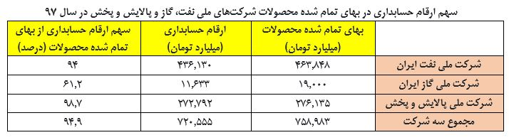 بررسی صورت های مالی شرکت های ملی نفت ایران، ملی گاز ایران و ملی پالایش و پخش فرآورده های نفتی ایران در سال 97 نشان می دهد که ارقام حسابداری نقش مهمی در بهای تمام شده محصولات سه شرکت اصلی زیرمجموعه وزارت نفت دارند که جزئیات آن به شرح زیر است: