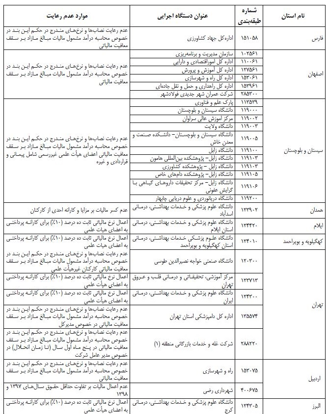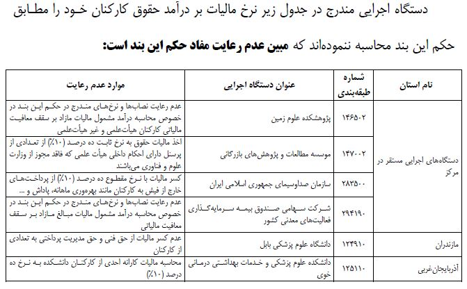 در محدوده بررسی ها، به استثناء دستگاههای اجرایی مندرج در جدول زیر، نرخ مالیات بر درآمد حقوق کارکنان بخش دولتی و غیردولتی پس از کسر معافیت مالیاتی موضوع ماده (۸۴) قانون مالیاتهای مستقیم مصوب ۱۳۶۶/۱۲/۴ و اصلاحات بعدی آن، در سال ۱۳۹۸ با رعایت نصاب های مقرر در حکم این بند محاسبه شده است.