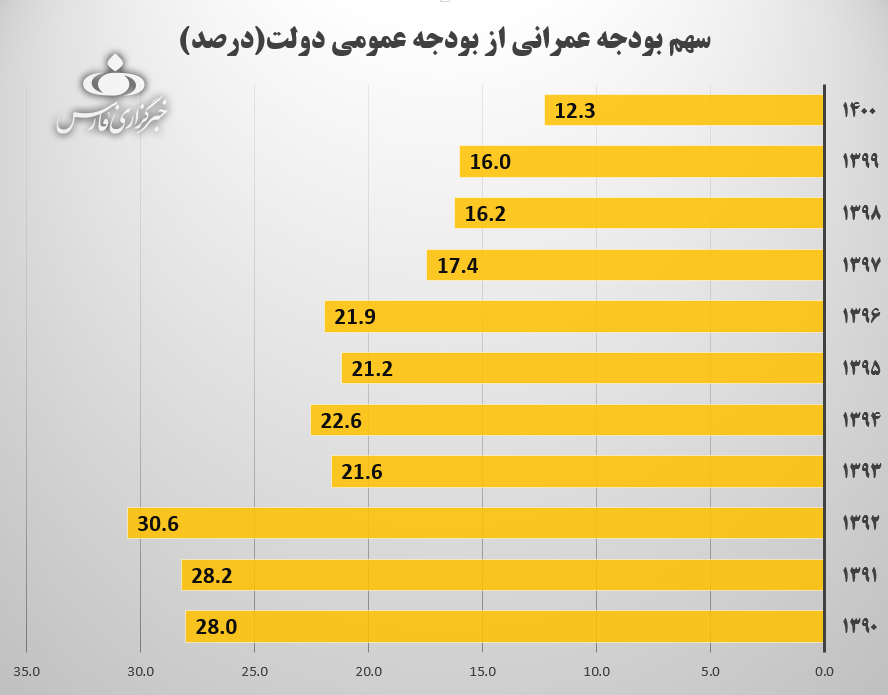 این درحالیست که در بودجه مرتبط با آخرین سال فعالیت دولت دهم، 30.6 درصد از کل بودجه عمومی دولت به بخش بودجه عمرانی اختصاص داشت اما این سهم در آخرین سال دولت دوازدهم به 12.3 درصد رسیده است.